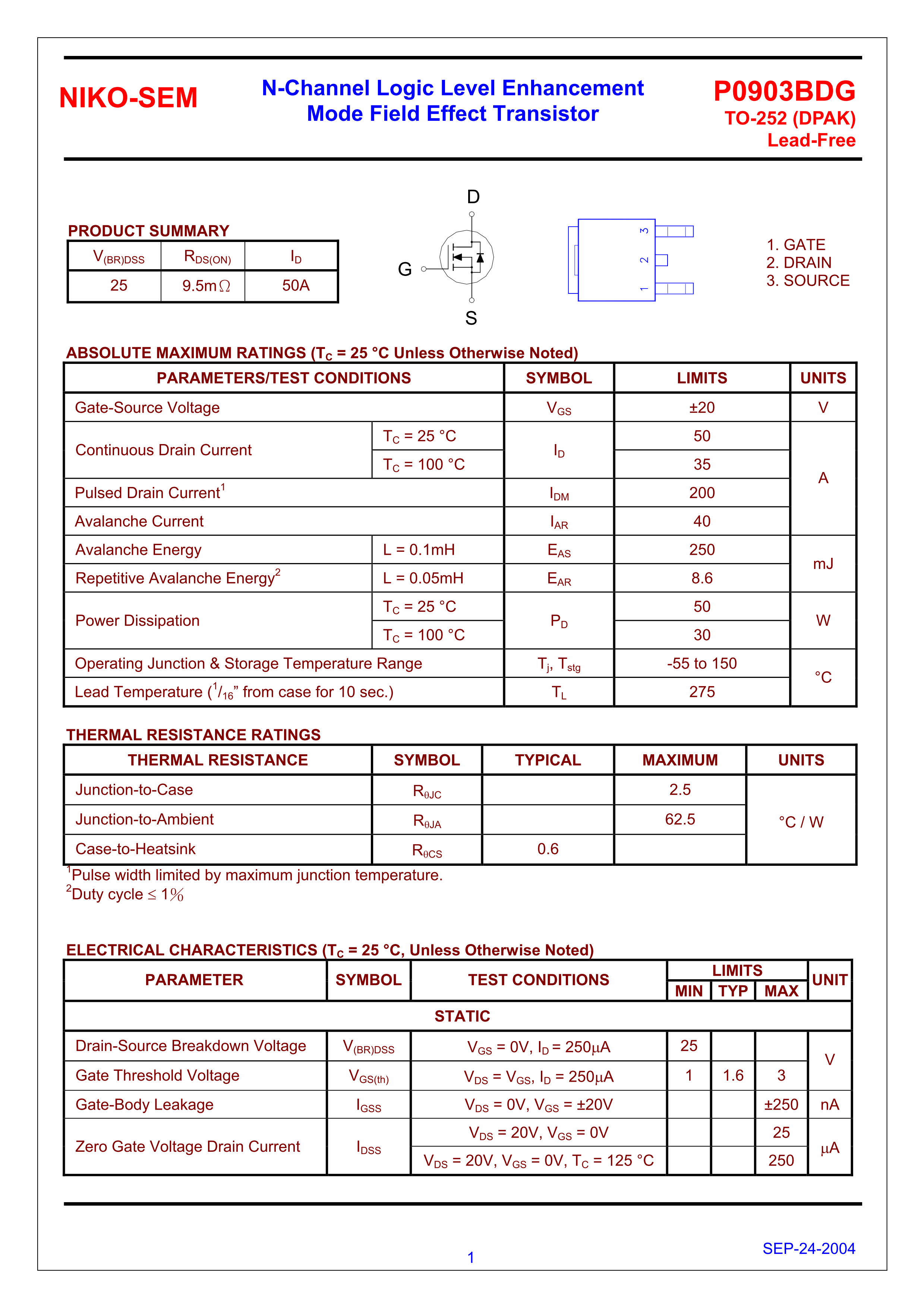 Даташит NIKO-SEM P0903BDG datasheet